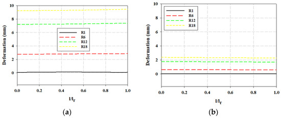 Deformation of the different rake pins at U = 0.2 m/s for (a) φr = −75° and (b) φr = 0°.