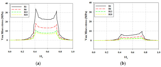 The von Mises stresses on the FSI boundaries of the rake were computed for the select rake pins for vertical and posterior positions of the rake. The stresses for the select pins at 0.2 m/s are shown in Figure 18, where l represents the displacement of the FSI boundary on the rake pin. The legend in the graph shows the selected rake pins of the rake movement mechanism. R1, R6, R12, and R18 represent the 1st, 6th, 12th, and 18th rake pins of the rake movement mechanism, respectively. The initial point of the FSI boundary on the rake is set at the tip of the pin. Furthermore, lr represents the total length of the rake pin. The two peaks in von Mises stress in each plot correspond to the stress concentrator (corner), wherein the rake teeth are attached to the rake head. When comparing the von Mises stress on the rake with the 2D analysis conducted by Ali et al. [7], their von Mises graphs exhibit rounded peaks, whereas the present study, which is conducted in 3D, shows pointed peaks. This can be attributed to the fact that the present study accounts for the full geometric complexity of the structure and thus allows for a more accurate representation of the stress distribution, particularly in regions where stress gradients are significant.