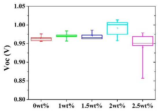 The optimal solvent additive doping rate was obtained by changing the composition ratio of dopant DIO against PEDOT: PSS. Figure 1 shows the change in the open circuit voltage (Voc), short circuit current density (Jsc), fill factor (FF), and power conversion efficiency (PCE) according to the composition ratio of the additive.