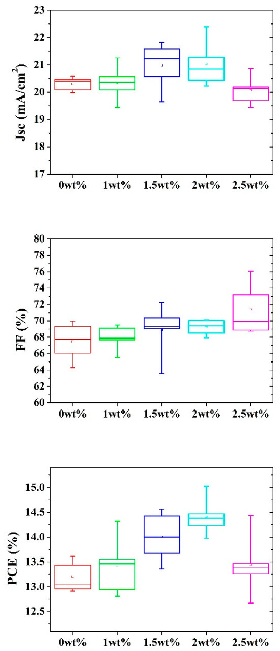 All of the measured device performances were averaged over at least 10 devices. The best device performance was obtained with a 2 wt% doping ratio and the Voc, Jsc, FF, and PCEs of the PSC at AM 1.5 100 mW/cm2 condition were 0.991 ± 0.024 V, 21.04 ± 0.86 mA/cm2, 0.692 ± 0.010, and 14.42 ± 0.39%, respectively. Since the best device performance was obtained with a 2 wt% doping condition, all the other studies were processed using this doping ratio. The PCE of the device fabricated on the un-doped PEDOT: PSS layer with conventional thermal annealing was 13.20 ± 0.31. Therefore, it can be concluded that doped PEDOT: PSS hole-transporting layer increased the PCE of the device by about 10%.