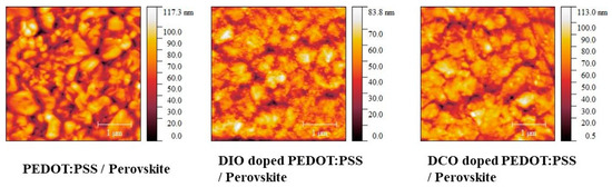 The surface roughness effect on the device performances was tested by preparing three different hole-transporting layers (un-doped PEDOT: PSS film, DIO-doped PEDOT: PSS film, and DCO-doped PEDOT: PSS film). Perovskite film was fabricated on these hole-transporting layers by the one-step method explained in the “Experiment” section. Figure 2 shows AFM topology images of the perovskite grain fabricated on these hole-transporting layers.