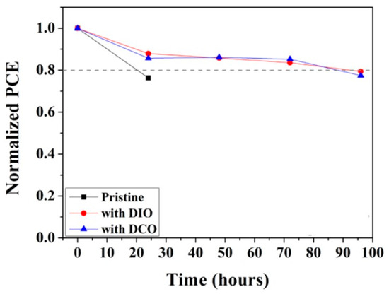 Long-term stability of the device was tested by measuring the time required for the PCE to fall below 80% of the initial value. DIO doping appeared to be slightly better than DCO doping on device performance. When a 200 W microwave was used to anneal PEDOT: PSS film, the processing time was reduced to 1/30th of that when thermal annealing was used without losing device performance. A lower power (50 W) microwave treatment was used for the post-annealing of the fully fabricated devices and it turned out to vaporize traces of moisture and prolong the lifetime of the device. Stability enhancement was studied using a larger area cell; the doped devices showed much more enhanced device lifetime compared with that for un-doped devices. According to larger size cell studies, the device lifetime was decreased as the cell area increased; however, as the size of the cell increased, the extent of lifetime enhancement through doping increased. These enhancements of long-term stability were attributed to the passivation process. The partially electro-negative halogen (i.e., Iδ− and Clδ−) in DIO and DCO could interact with the Pb2+ of the perovskite crystal while the hydrophobic aliphatic moiety (i.e., partially positive octyl groups) can passivate the surface of perovskite thin film from moisture. This passivation effect through the surface modification of the perovskite grains could be beneficial for the long-term stability of devices and is well studied [14,25,26,27,28].