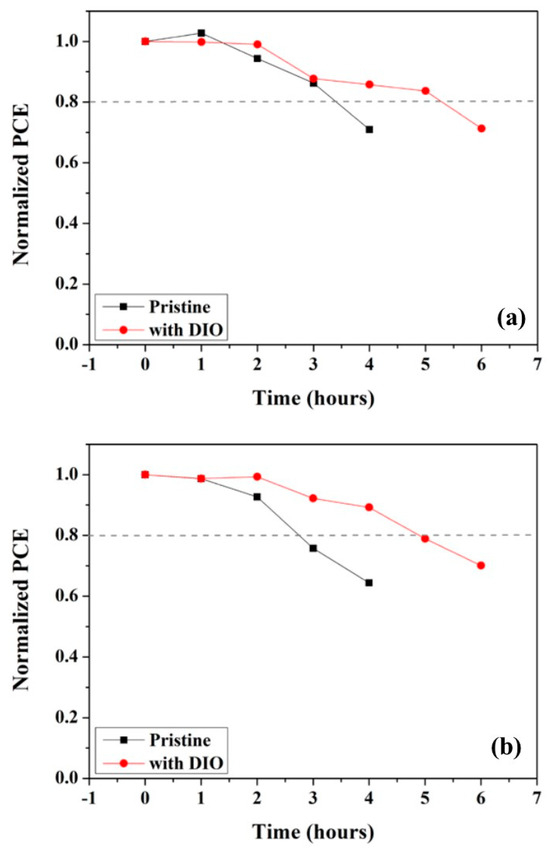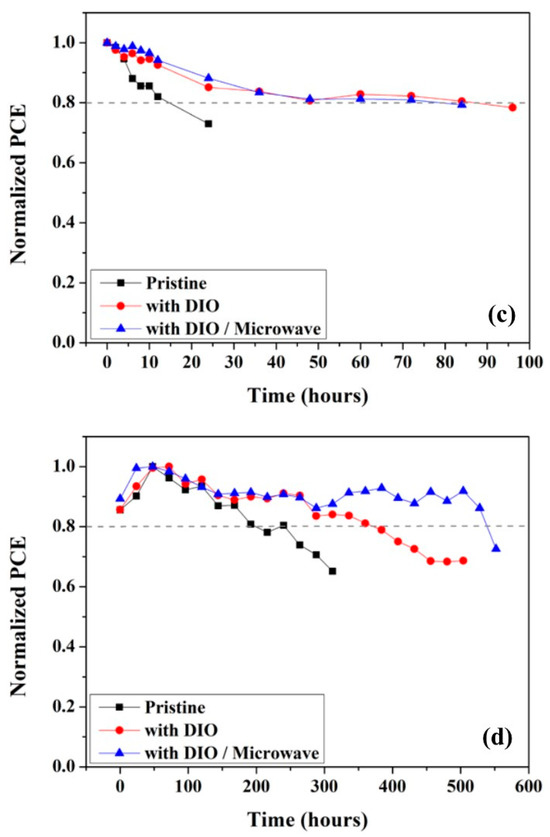 Long-term stability of the larger area device was also studied. The time required for LT80 conditions was measured while the devices were exposure to 100 mW/cm2 of solar simulator light at a relative humidity of 35% without device encapsulation (Figure 7a,b). Figure 7a shows the 0.09 cm2 cell data whereby the LT80 for an un-doped cell was 3.4 h and that for a 2 wt% DIO-doped cell was 5.3 h. The lifetime of doped devices was enhanced by about 1.6 times compared with that for un-doped devices. Figure 7b shows the 0.36 cm2 cell data whereby the LT80 for an un-doped cell was 2.7 h and that for a 2 wt% DIO-doped cell was 4.9 h. The lifetime of doped, larger-size devices was enhanced by about 1.8 times compare to that for un-doped devices. Even though the absolute value of the LT80 for larger-size cell decreased as the cell area increased (i.e., in the case of doped cells, 5.3 h for 0.09 cm2 cell and 4.9 h for the 0.36 cm2 cell), as the size of the cell increased the extent of the lifetime enhancement through doping increased (i.e., 1.6 times for the 0.09 cm2 cell and 1.8 times for the 0.36 cm2 cell). Since the device lifetime was very short when the device was exposed to solar simulator light without encapsulation and to mimic a more realistic situation, the device storage method was changed. The devices were stored at a relative humidity of 35% without device encapsulation; however, Figure 7c,d show the PCE changes as a function of time for the devices stored in scattered light (Figure 7c) and in the dark (Figure 7d). Figure 7c shows the PCE changes for the 0.09 cm2 cell data; LT80s were dramatically increased compared with the devices exposed to the illumination with the same device area (i.e., Figure 7a).
