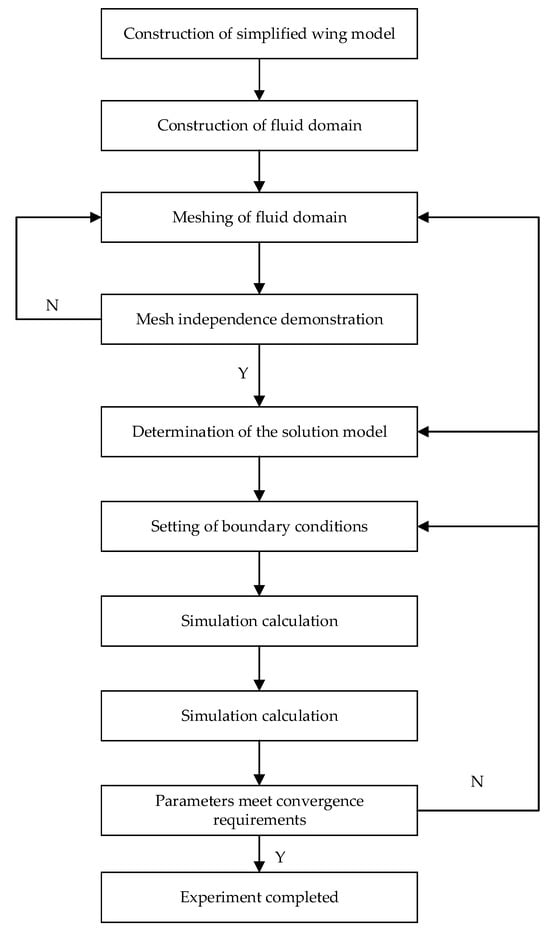 The structured hexahedral meshing of the fluid domain model is performed using ICEM-CFD. Structured grids offer faster grid generation, higher quality, and better suitability for fluid flow and wing surface tension calculations than unstructured grids. The high curvature at the leading and trailing edges of the wing necessitates the generation of finer grids to ensure computational accuracy. However, simply increasing the number of grid nodes significantly reduces the efficiency of numerical calculations. Therefore, the O-block meshing method is adopted to refine the wing’s boundary layer mesh. This method divides the boundary area into several small areas like circles, making the distribution of grid points more uniform and improving accuracy and computational efficiency, especially in the simulation of fluid physical properties. The O-grid can better adapt to the complexity of the geometric structure, so it is more suitable for complex flow simulations such as high-speed flow and turbulence.