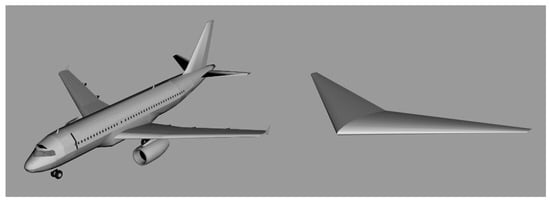 Figure 2 illustrates the complete model of the Airbus A320 [24] and the simplified wing model used for numerical simulations. There are two primary reasons for this approach. Firstly, the aircraft’s trailing vortex is primarily generated at the wingtip, and a smoother wing configuration enhances the strength of the trailing vortex, aiding in the subsequent extraction and analysis of vortex parameters. Secondly, modeling the entire aircraft and conducting flow field simulations would require a significant number of grids and computational time, with little considerable benefit for the subsequent analysis of the vortex field. Therefore, it was decided to simplify the geometric model of the Airbus A320 [25], retaining only the wing section responsible for generating wingtip vortices. Table 1 presents the wing parameters of the Airbus A320.
