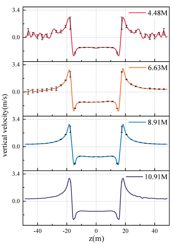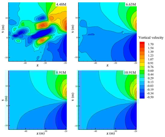 Figure 4 illustrates the results for these four grid sizes under the same numerical simulation conditions. The black short line represents the benchmark results obtained with the 10.91 million grid. The error values for the other three grid sizes are also shown. Figure 5 displays the vertical velocity cloud map at z-axis coordinates ≤ −20 m.
