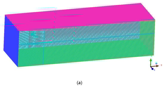 where is the dynamic viscosity of the fluid, is the velocity of the fluid flow, and takes the value of 1. The grid height of the attached surface layer is taken as 2 × 10−3 mm in the actual division. The grid quality after partitioning ranges between 0.251 and 1. Figure 6 displays the grid partitions within the computational domain, and Table 3 provides specific details regarding the grid partitioning parameters.