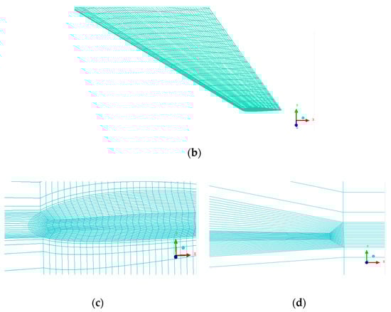 Computational fluid domain grid partition. (a) Overall; (b) wing outer boundary; (c) wing leading edge; (d) wing trailing edge.