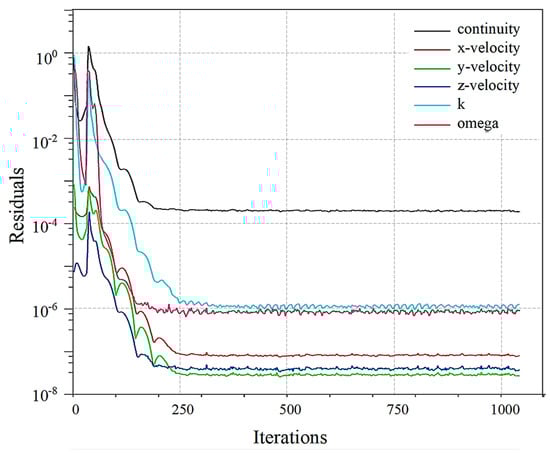 Since the numerical simulation cases used in this study have a very high similarity, and the evolution of the tail vortex under different working conditions is investigated, and only some of the boundary conditions and velocity values are adjusted under different vertical wind speeds, batch processing can be used to improve the computation rate, and the relevant code files are contained within the Supplementary Materials. The algorithm selects a coupled algorithm, and the pressure, momentum, turbulent energy equations, and diffusion terms were discretized using the second-order upwind scheme. During the calculation process, we monitor the residual values of the variables to determine whether the convergence is reached. Figure 7 shows the state of convergence of the computed parameters with the number of iteration steps in the simulation calculations.