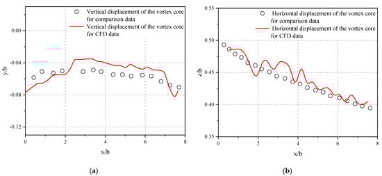 Comparison between the results of references and numerical simulations. (a) Vertical displacement of the vortex core. (b) Horizontal displacement of the vortex core.