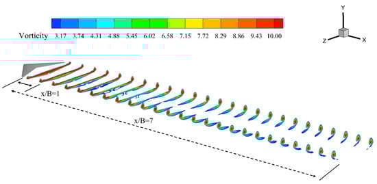 The vorticity magnitude is an important parameter describing the strength of the wake vortex, where the vorticity magnitude is expressed as follows [11]. The maximum vorticity magnitude in the vertical plane is the location of the vortex core, and the distance between the two vortex cores is the vortex core spacing.