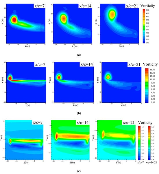 Figure 11 shows the vorticity contours at different distances behind the wing under different vertical wind speeds. The statistics show that the airflow will flow from the high-pressure region to the low-pressure area, forming a vortex structure extending backward from the tip of the wing. The vorticity is highest at the vortex core, gradually decreasing outward from the center. The vortex core radius also enlarges with increasing distance from the wing’s trailing edge.