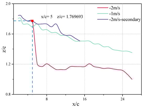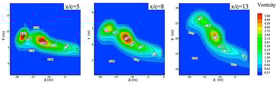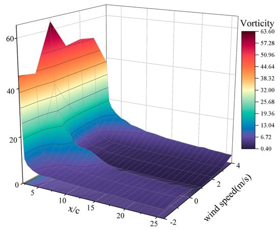 Figure 15 and Figure 16 display the horizontal position of the secondary vortex core and vorticity cloud maps at different places behind the wing. At the x/c = 5 cross-section, the vorticity of the primary and secondary vortex is consistent. However, the vorticity decay rate and horizontal position change in the two vortices show different trends. The vorticity of the secondary vortex decays more rapidly, and by the x/c = 15 cross-section, it has attached itself to the outside of the primary vortex and merged with it. The horizontal position reduction in the secondary vortex is consistent with the conditions under −1 m/s wind speed.