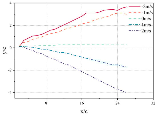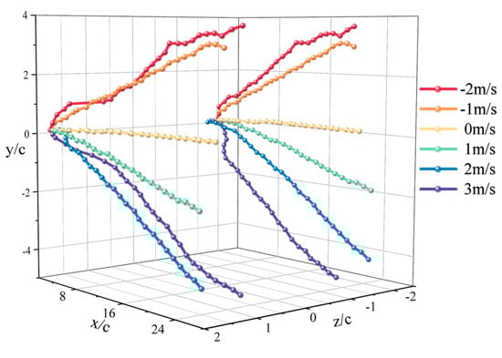 Figure 13 presents the distribution of three-dimensional vortex core trajectories under different vertical wind speeds. The two intersecting points on the left and right correspond to the locations of the wingtips. The changes in the vortex core, both in vertical and horizontal displacement, are visually depicted with distance traveled.