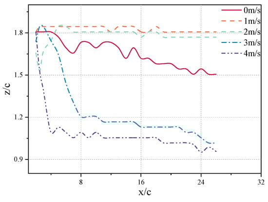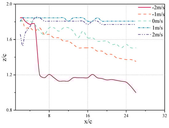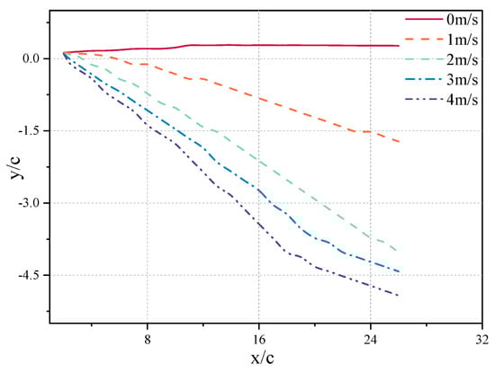 Figure 19 and Figure 20 depict the horizontal and vertical displacement distributions of the vortex core under various positive wind speeds, respectively. Figure 18 shows that under wind speeds of 1 m/s and 2 m/s, the vortex core undergoes a brief contraction before stabilizing and oscillating. The vertical wind component restrains the reduction in vortex core spacing. Under wind speeds of 3 m/s and 4 m/s, the vortex core initially contracts rapidly (with contraction nodes at x/c = 4 and x/c = 8) and then steadily contracts at a slower rate. As indicated in Figure 11e, the sudden horizontal displacement of the vortex core results from the detachment of secondary vortices from within the primary vortex due to the instability of its rotation. After the secondary vortices detach, the primary vortex structure stabilizes, and the rate of horizontal displacement reduction becomes steady. Consequently, the changes in vortex horizontal displacement do not exhibit a linear relationship with vertical wind speed. Under wind speeds of 1 m/s and 2 m/s, the vortex core spacing reduction rate is less than that under still air conditions, resulting in a larger downwash danger zone, indicating an increased risk of encountering wake turbulence for following aircraft.