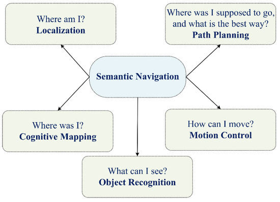 As illustrated in Figure 1, the design and development of a robot semantic navigation system involve several functions: localization, which entails estimating the robot’s position; path planning, which involves determining the available paths in the navigation area; cognitive mapping, which encompasses constructing a map of the area of interest; motion control, which governs how the robot platform moves from one point to another; and object recognition, which involves identifying objects in the area of interest to build a semantic map [10,11].