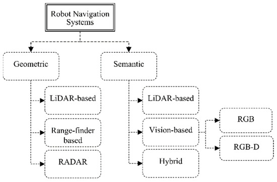 - Array of sensors: This metric involves the list of sensors used in the robot semantic navigation system. Typically, a vision-based system and a LiDAR (light detection and ranging) sensor are required to establish a semantic navigation map. The integration of additional sensors may enhance semantic navigation capabilities, but it also introduces additional processing overhead, power consumption, and design complexity. Therefore, it is important to choose suitable perception units. Several robot semantic navigation systems have employed LiDAR- and vision-based sensors to obtain geometry information, visual information, and proximity information, and the fusion of these sensors has achieved better robustness compared to using individual LiDAR or camera subsystems.