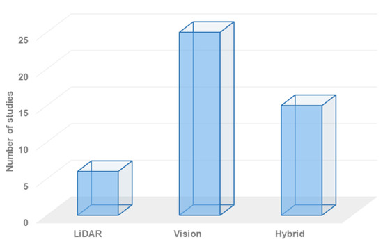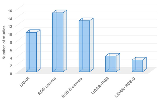Figure 8 provides an overview of the employed sensing technologies in recently developed systems, presenting statistics on their usage. On the other hand, semantic navigation systems that combine RGB cameras and LiDAR units have the potential to construct a semantic map with rich information. However, these technologies have received less attention due to the higher requirements in terms of processing capabilities, complexity, power consumption, and cost.