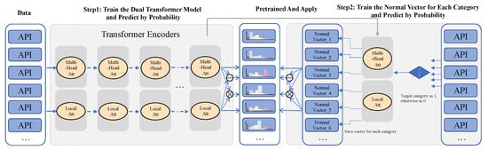 Figure 1 illustrates the overall process of our two-step methodology incorporating a dual attention Transformer. The approach takes API calls as its input and produces predictions for the respective categories. In the first step, a multi-head attention mechanism and local attention are employed within a multiple dual Transformer encoder to capture and represent samples as vectors. Following activation, the model yields probabilities indicating the likelihood of each sample belonging to specific categories for predictive purposes. Moving to the second step, the model treats API call classification as a binary classification task to train individual models, leveraging the pre-trained model from the initial step. Subsequently, the methodology stores the final weights of these models as Normal Vectors, serving as representations for the respective classes and facilitating future predictions. This two-step strategy enables us to proficiently accomplish the malware classification task, optimizing it effectively, with each step addressing distinct optimization objectives.