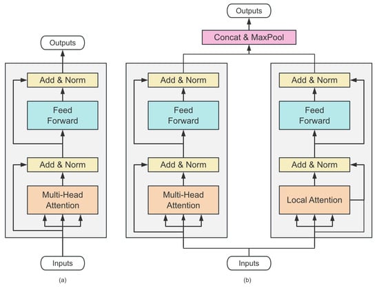Network structure comparison. (a) The original Transformer network structure; (b) dual attention Transformer encoder.