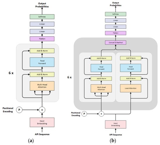 Transformer architecture delivers a good design of attention mechanisms; some work employs another attention module to capture the information. Yang [30] proposes to capture features from binary files using stacked CNNs and assembly files via triangular attention and then fuse all features via cross-attention. Their experimental results show that the method can extract both global and local features to improve the detection of malware variants effectively. Moreover, the local attention mechanism is very popular and effective in processing local features. Ma [31] points out that the mutual result of both global and local attention is useful to capture semantics and generate the most informative and discriminative features for text classification. Inspired by the success of local attention in text classification, this paper employs local attention as a complement to global attention to process short-term information in the classification of malware API call sequences.