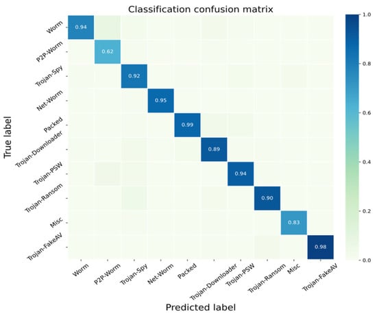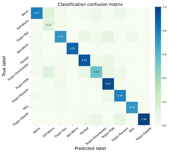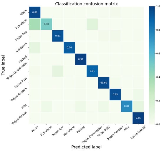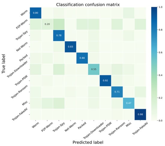 Based on the DAT encoder (D = 2), we test against 10 kinds of malware. As can be seen in Table 7, the F1-scores for different malware categories varied, indicating the model’s effectiveness in distinguishing between different types of malware. The model demonstrated high F1-scores in categories such as Trojan-FakeAV (0.96) and Net-Worm (0.92), indicating its proficiency in classifying instances from these categories. The results can be seen in the confusion matrix in Figure 4. There are two categories that are significantly lighter in color. However, the model still faced challenges in accurately classifying P2P-Worm, Trojan-Downloader, and Trojan-Ransom categories, as reflected by lower F1-scores (0.12, 0.45, and 0.58, respectively).