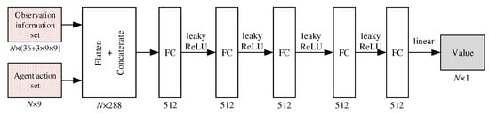 In Figure 6, N is denoted as the number of all agents. The observation information, i.e., the design of the area observation information presented in this paper, includes the following: the dimension size of the agent information was 36, and the collaborative information included three 9 × 9 lattice maps. Each agent had a discrete set of actions of size nine. Finally, the observation information of all agents and the set of actions within all agents were amalgamated and combined. Therefore, the dimension size was N × 288, which was then inputted to the hidden layer with a dimension size of 512. The overall structure consisted of five layers.
