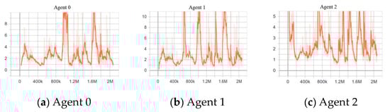 Experimentally, it can be seen that the loss function of the central critic varied for different agents. This is because each agent observed a different state. Different strategy networks also performed different actions with corresponding reward values. However, the performances of the three proxies were similar, partly because they used the same reward function. The random generation of locations can help the agent to learn different experiences during training.