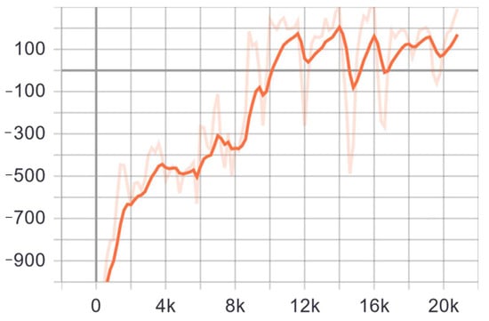 Figure 9 shows the average value of rewards received by all agents in each round, where the x-axis is the number of training iterations, and the y-axis is the reward value. It can be observed that as the number of rounds increased, the number of times the agent interacted with the environment also increased. The agent also learned from the reward values obtained by the environment how to achieve better results from the designed training environment.