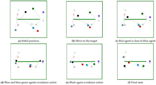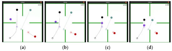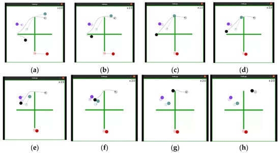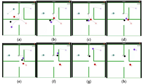 The interaction of the four agents in Environment 5 is shown in Figure 14. This can be seen at the 01:22~01:36 time stamp in the experimental video. Figure 14a shows the randomly generated agent and target locations. Figure 14b,c show each agent going to the destination. Figure 14d–g show the continuous graph of the purple agent reaching the target point. Since the black agent had to pass through the location of the purple agent, the purple agent’s avoidance behavior allowed all agents to reach their respective destinations smoothly. Figure 14h shows the final status at the end of the round.
