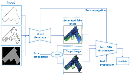 To address the challenge of generating high-quality X-ray images of prohibited items, we explored image augmentation using generative adversarial networks (GANs) with Pix2Pix and Pix2PixHD as our core frameworks. We implemented a novel three-channel input technique to augment the model’s ability to produce high-quality X-ray images. The first channel was dedicated to masks, assigning specific pixel values to distinctly identify object categories. The second and third channels incorporated edge data: Edge01, extracted from the shape of the object, and Edge02, generated through automated edge detection techniques on ground-truth images. The integration of Edge1 and Edge2, known as “Hybrid Edge”, was designed to overcome the limitations of single-channel inputs, which often lacked detail and texture.
