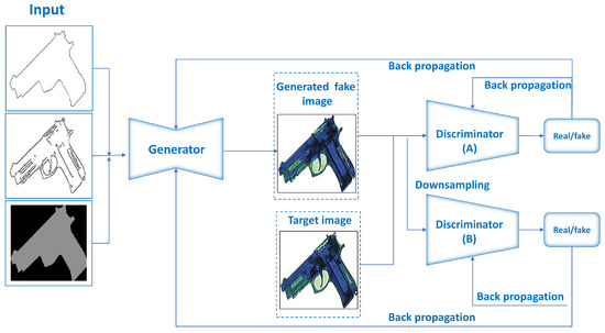 Pix2PixHD model: Developed by TC Wang [47], it enhances the original Pix2Pix framework by focusing on generating high-resolution images. This model is good at producing more detailed images through the use of multi-scale generator and discriminator components. Pix2PixHD features a coarse-to-fine generator that includes a global generator network, which concentrates on broader and more general features like external contours and geometric structures, alongside a local enhancer network that focuses specifically on the finer details, such as the textures of objects. The discriminator network’s architecture in pix2pixHD is similar to that of the original Pix2Pix, but it employs multiple discriminators, specifically, two in this case, that operate at different scales. This dual-discriminator setup enhances the generator’s ability to create finely detailed X-ray images, as illustrated in Figure 4. The objective function of Pix2PixHD introduces an additional feature matching loss to ensure that the generated images not only deceive the discriminator but also closely align with the feature statistics of real images. The Pix2PixHD loss function is defined as: