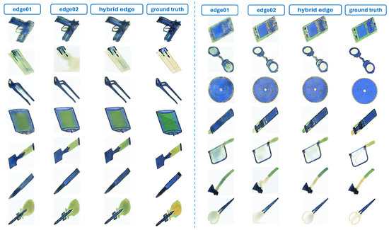 Addressing the limitations found in generating X-ray images with Edge01 and Edge02, we used Hybrid Edge as the input, which is designed to provide a comprehensive solution that not only accurately delineates the object’s shape but also captures its internal nuances and material differences with greater precision, as shown in Figure 8. The development of Hybrid Edge significantly improved object representation, as demonstrated by the method achieving the best scores on different edge inputs, confirming its superior effectiveness in generating high-quality and detailed X-ray images.