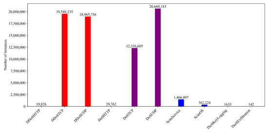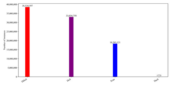 The dataset consists of 72 million records and encompasses 42 features, rendering it notably extensive with a substantial size of 17.87 GB. The dataset contains a hierarchical structure as depicted in Figure 1. The dataset exhibits imbalance, evident in the significant variation among the instance counts for each class, as illustrated in Figure 2 and Figure 3. Due to the extensive size of the dataset, making it impractical to train the proposed method, we addressed this challenge by undersampling classes with more than one million instances. Specifically, we randomly selected 20% from each of these classes while retaining all samples for the remaining classes.