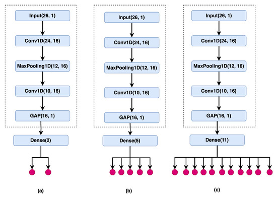 The primary structure of the backbone model includes Conv1D, MaxPooling, Conv1D, and Global Average Pooling (GAP). The adoption of Global Average Pooling (GAP) in place of the flattened layer has resulted in a decrease in the overall parameter count. The total parameters in the backbone model sum up to 848, reflecting a notably compact size. For the three non-hierarchical models, the parameter counts are 882 for the first model Figure 4a, 933 for the second model Figure 4b, and 1035 for the final model Figure 4c.