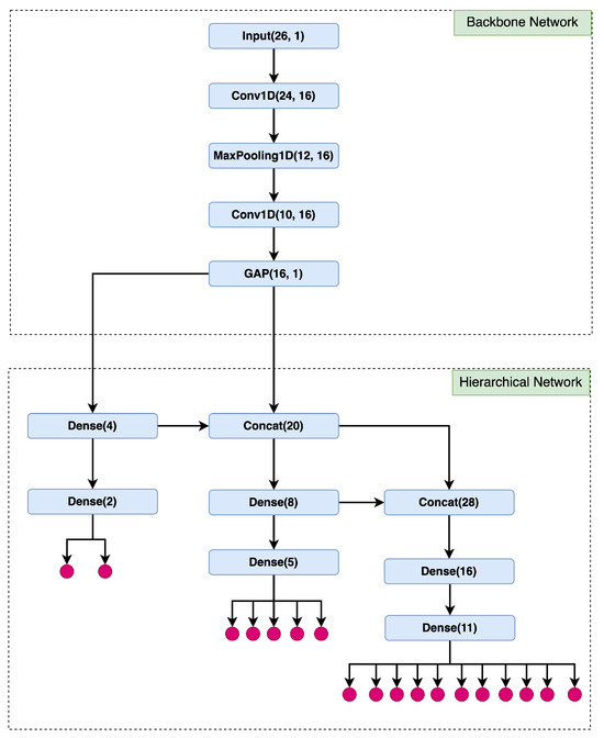 Numerous investigations have highlighted the efficiency of employing CNN in the classification of tabular data [10,11,13]. In the present research, we introduce a lightweight CNN model tailored specifically for this purpose. As presented in the Section 3.1, the dataset at hand exhibits a hierarchical arrangement. Consequently, we put forth a novel approach employing a Hierarchical Convolutional Neural Network (HCNN). This architecture utilizes a common backbone depicted in Table 1, yet diverges into distinct models corresponding to each level within the hierarchical structure. This strategy enables a comprehensive exploration of the HCNN’s impact by comparing the performance across different hierarchy levels.