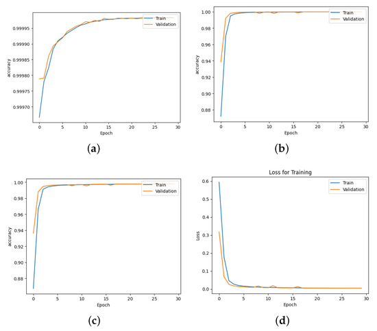 Training curve of HCNN accuracy across different levels: (a) initial level, (b) second level, (c) third level; (d) represents overall training loss.