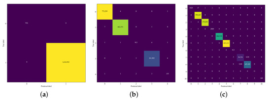 Confusion matrices for (a) the level with 2 classes, (b) the level with 5 classes, and (c) the level with 11 classes.