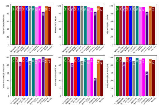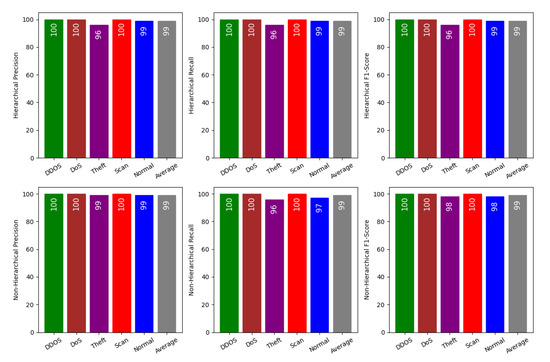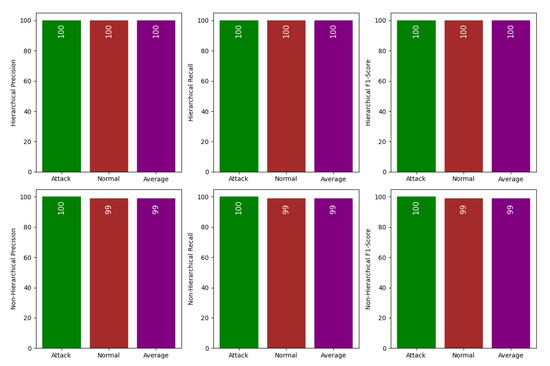 The outcome of the proposed approach presented in Figure 8 pertains to the classification performance of the models at the initial hierarchy level, encompassing two categories: “attack” and “normal”. Examining the results outlined in Figure 9, it becomes evident that there is no notable performance improvement at the second level attributable to the hierarchical organization of the model, with both models showcasing comparable scores. Considering these observations, it can be inferred that the hierarchical structure’s impact is not markedly significant at the first level.