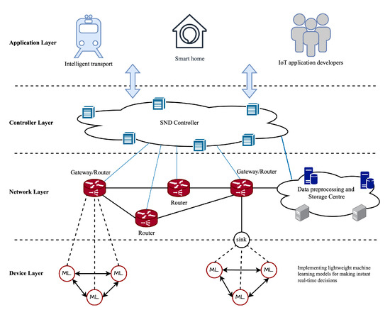 SDN-enabled IoT architecture and ML model deployment on the device layer.