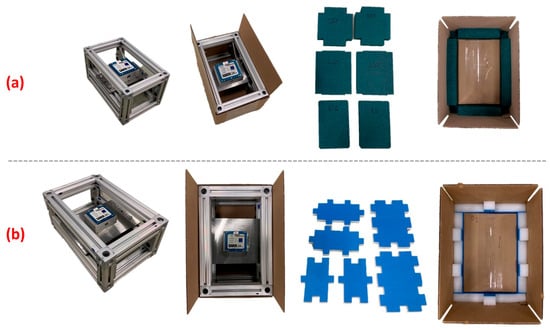 The inner box was surrounded with PE foam planks. The material and thicknesses of the PE foam planks used as cushioning materials were selected to ensure the field data recorders did not experience more acceleration than they could handle (200 g). Ethafoam 220 planks with laminated Ethafoam 600 skin manufactured by Sealed Air Corporation (Charlotte, NC, USA) were used for the medium decoys. Six planks were placed all around the inner box, with a thickness of 44.45 mm (1.75 in.). For the small decoys, 38.1 mm (1.5 in.) thick Ethafoam 220 planks manufactured by Sealed Air Corporation were used.