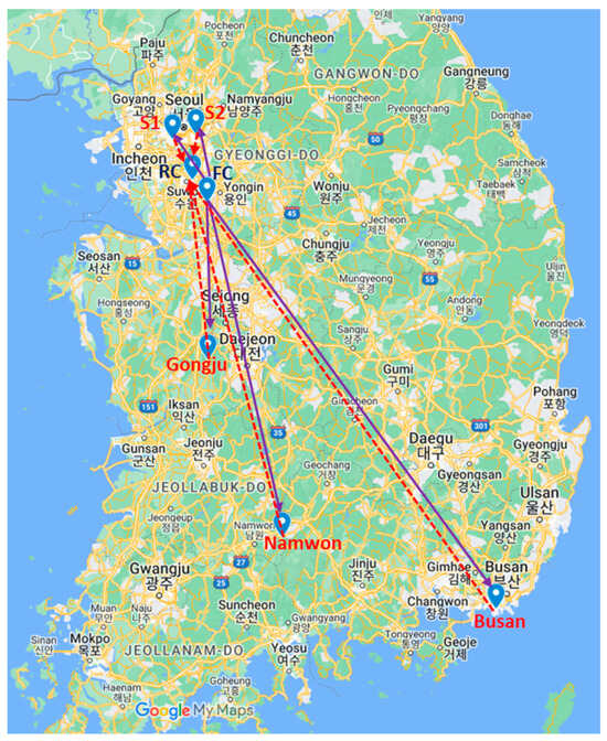 A total of five different shipping routes were selected to represent the Korean shipping environment. Two different destinations were selected within Seoul (S1 and S2) since the parcel delivery volume is highly concentrated within the Seoul capital area []. Further regions, such as Busan, Namwon, and Gongju, were also selected as destinations to allow the decoys to experience various handling points (different regions’ hub terminals and sub terminals). All the decoys were shipped out from a fulfillment center (FC) located in Dongtan, Korea, to their destinations and then shipped back to a Research Center (RC) in Suwon, Korea, via a ground shipping service. The mapped-out shipping routes can be seen in Figure 3.