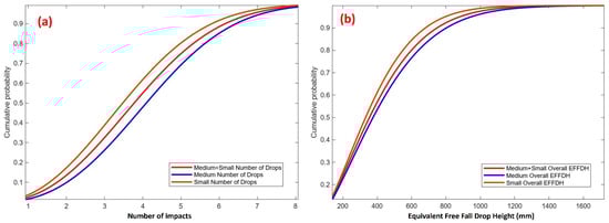 CDF plot of the (a) number of drops and (b) the calculated equivalent free-fall drop height (EFDH) for the overall dataset as a function of package size and weight. Medium + small indicates a combination of data obtained from both medium- and small-sized boxes, medium indicates data obtained from medium-sized boxes, and small indicates data obtained from small-sized boxes.