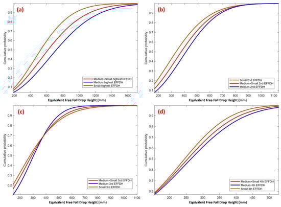 Cumulative percentage versus EFFDH for medium boxes, small boxes, and medium and small boxes combined. (a) CDF plot for the highest EFFDH. (b) CDF plot for the second highest EFFDH. (c) CDF plot for the third highest EFFDH. (d) CDF plot for the fourth highest EFFDH. Medium + small indicates a combination of data obtained from both medium- and small-sized boxes, medium indicates data obtained from medium-sized boxes, and small indicates data obtained from small-sized boxes.