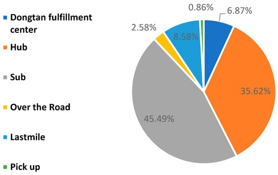 Figure 6 and Figure 7 present the shock and impact occurrence as a function of the handling and facility type. It was observed that approximately 80% of shock and impact events occurred within the hub and sub terminals. This could be explained by the significantly higher frequency of shock/impact events that occur during the loading and unloading processes, which mostly happen when trucks arrive at the hub and sub terminals. Sorting and last-mile delivery processes also produced a considerable number of shock events. This may be due to the manual sorting processes that are occasionally required to clear out jammed conveyors or to delivery personnel throwing packages at the door to speed up the delivery process.