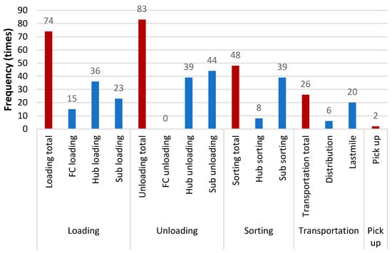 Shock/impact occurrence as a function of the handling mode and facility type. Red bars indicate the total number of shocks and impacts of each type of handling mode. Blue bars indicate the number of shocks and impacts of certain handling modes from different types of facilities. Red bars indicate the total number of shocks that occurred during each handling mode, and blue bars indicate the number of shocks that occurred during each handling in different facilities.