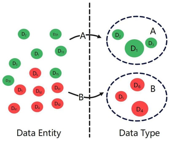 The data resource (DAT) is stored in a data graph (DG), which is an independent object obtained by direct human observation or sensor collection of real-world objective existences. It is not tied to anyone’s intention and is presented in the form of the most straightforward collection. It does not have any substantive content without contextual semantics. Data can be divided into data type () and data entity (), according to the definition of meaning, use, and transformation, as shown in Figure 2. Data type represents data with typing ability and is divided into conceptual data (), collection data (), and range data (). Data instantiation represents specific people, things, and objects, which can be formalized as follows: