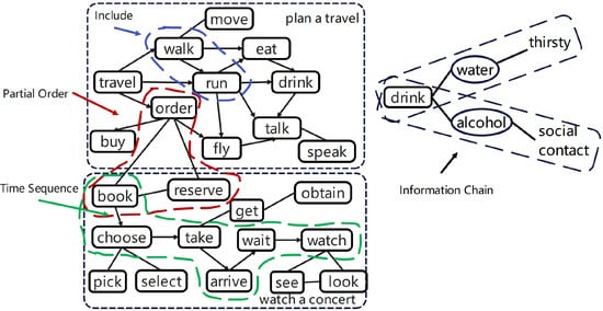 The information partial order () relationship refers to the comparison and state change among information nodes with similar semantics or the unidirectional semantics and logical deduction exhibited by information resources when describing the development process of things. For example, the verb “order/book/reserve” has the same meaning in this context but is represented in multiple ways. The information temporal () relationship indicates that some information nodes do not have a direct semantic relationship but show a temporal connection in the sentence. For instance, verbs like “choose”, “take”, and “arrive” are temporally related in this context. The information include () relationship refers to grouping overly lengthy semantic information or information chains to obtain information nodes with a smaller semantic coverage range. For example, “walk” includes “run” since walking encompasses running. In the information chain, the action “drink” can be associated with “water” or “alcohol”, where drinking water implies the purpose of thirst, and drinking alcohol implies the purpose of socializing. This can be formalized as follows: