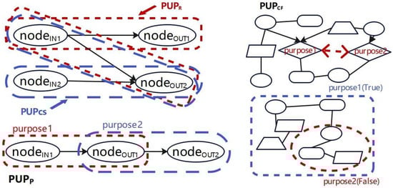 Purpose (PUP) resources are some hidden or obvious purposes that humans have for a particular thing and are explicit representations of human beings’ efforts to solve a particular problem or satisfy a certain need. We can interpret them as function PUPs that take DIKW resources as input and obtain the output of DIKW resources. The input and output DIKW resources can be specific to DAT, INF, KNG, or WIS nodes. We consider whether the input nodes between intents have purpose relevance (), purpose consistency (), purpose partial order (), and purpose conflict (), formally represented as follows: