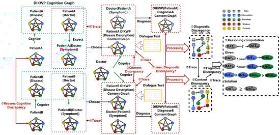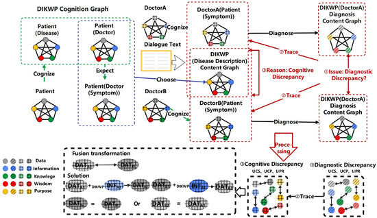 We address these issues by taking the consultation process as the primary research object, tracking the whole process of outpatient consultation in local hospitals, and collecting the text of doctor–patient outpatient dialogues and records of test items. The cognitive bias between doctors and patients comes from the fact that the subjective external expression of the interacting subject (doctor–patient) is only a part of his/her internal cognition, and the interacting subject will draw a DIKWP cognitive picture for the other, which is different from the actual subject’s cognitive picture. Therefore, we construct an intrinsic DIKWP cognitive model and an extrinsically expressed DIKWP content model for doctors and patients to make the doctor–patient interaction process transparent. The doctor–patient DIKWP cognitive model interacts with the patient/doctor DIKWP content model to form a DIKWP diagnostic content model, which is associated and mapped with DIKWP uncertainty to form a discrepancy space. Some elements of the difference space are processed using DIKWP inference computation and fusion transformation technology, and finally, a solution is given.